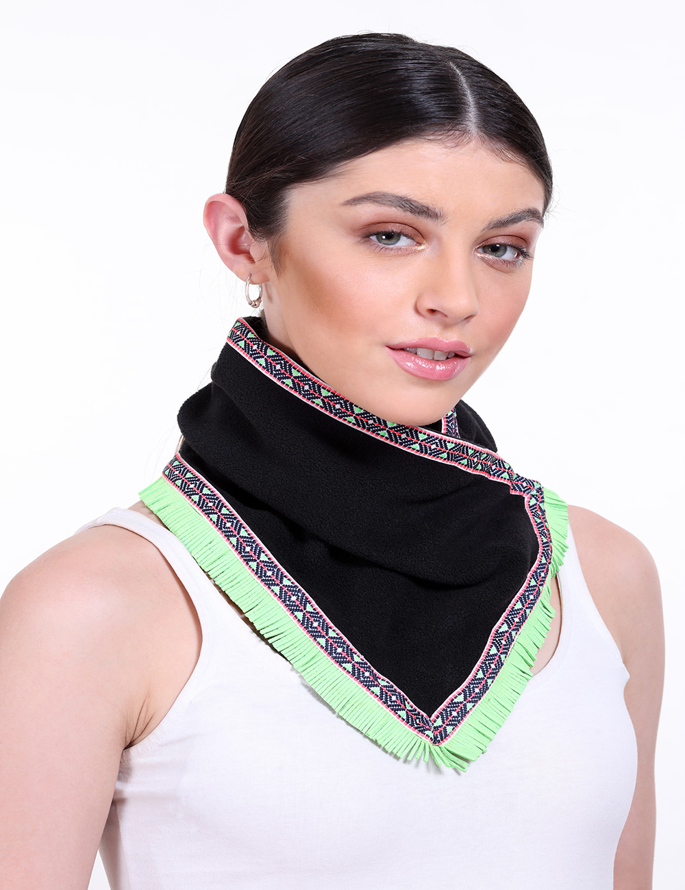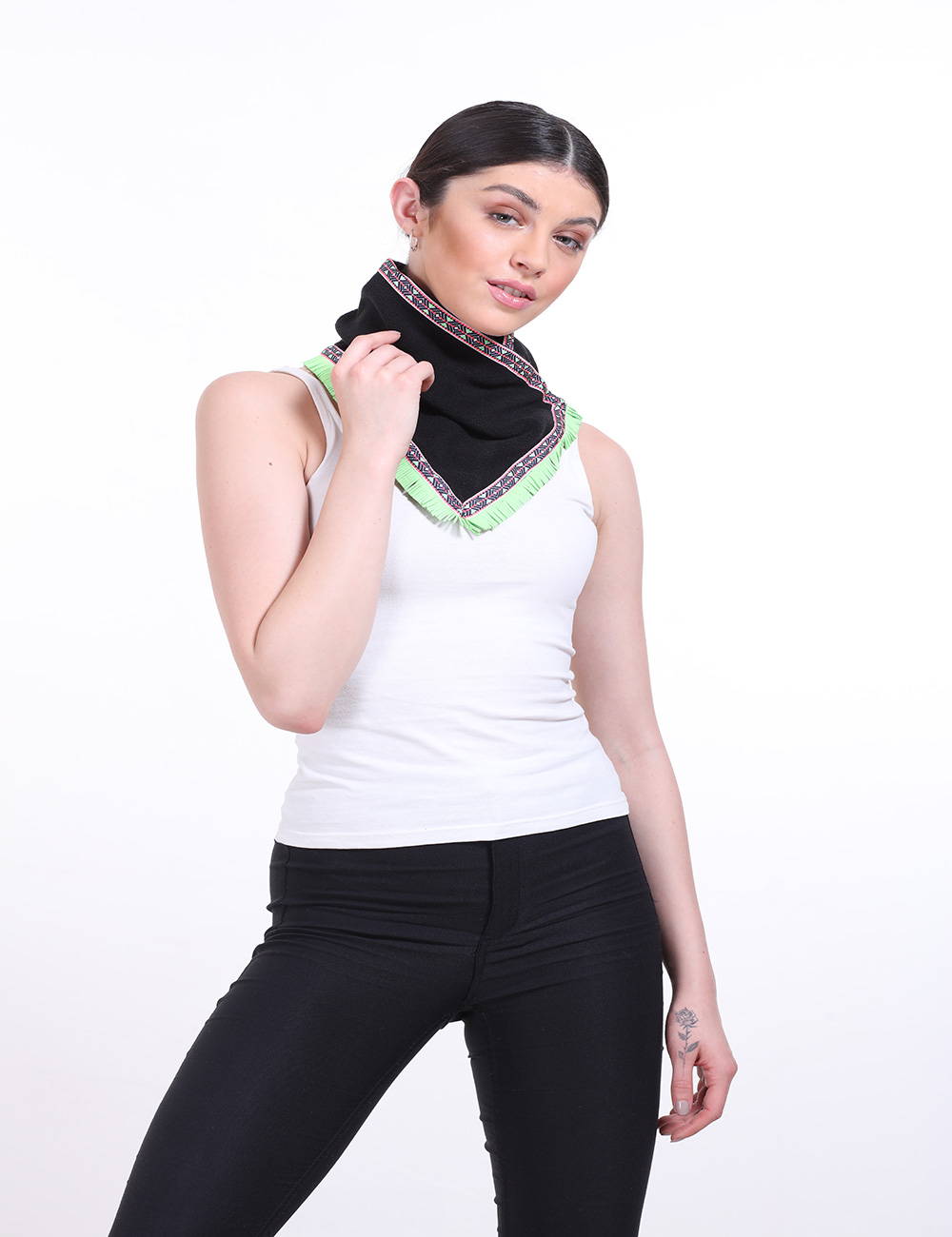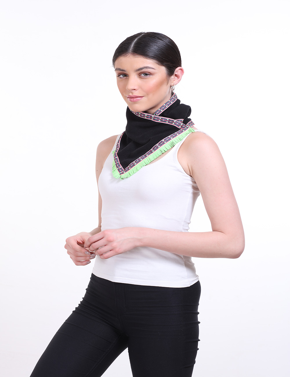 This beautifully handmade One of a Kind winter scarf gives you an enhanced look. It has black fleece lining with all over neon lace. It is finished off with green suede tassels at the border.