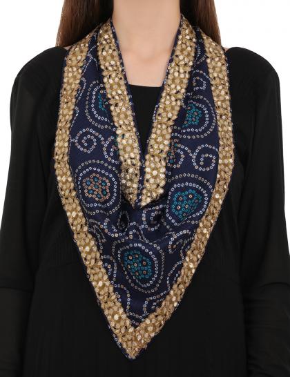 Purple Sunshine's blue chanderi scarf is a versatile addition to your wardrobe. This One of a kind, handmade scarf has rayon & satin lining with gold flower & leaf string border.