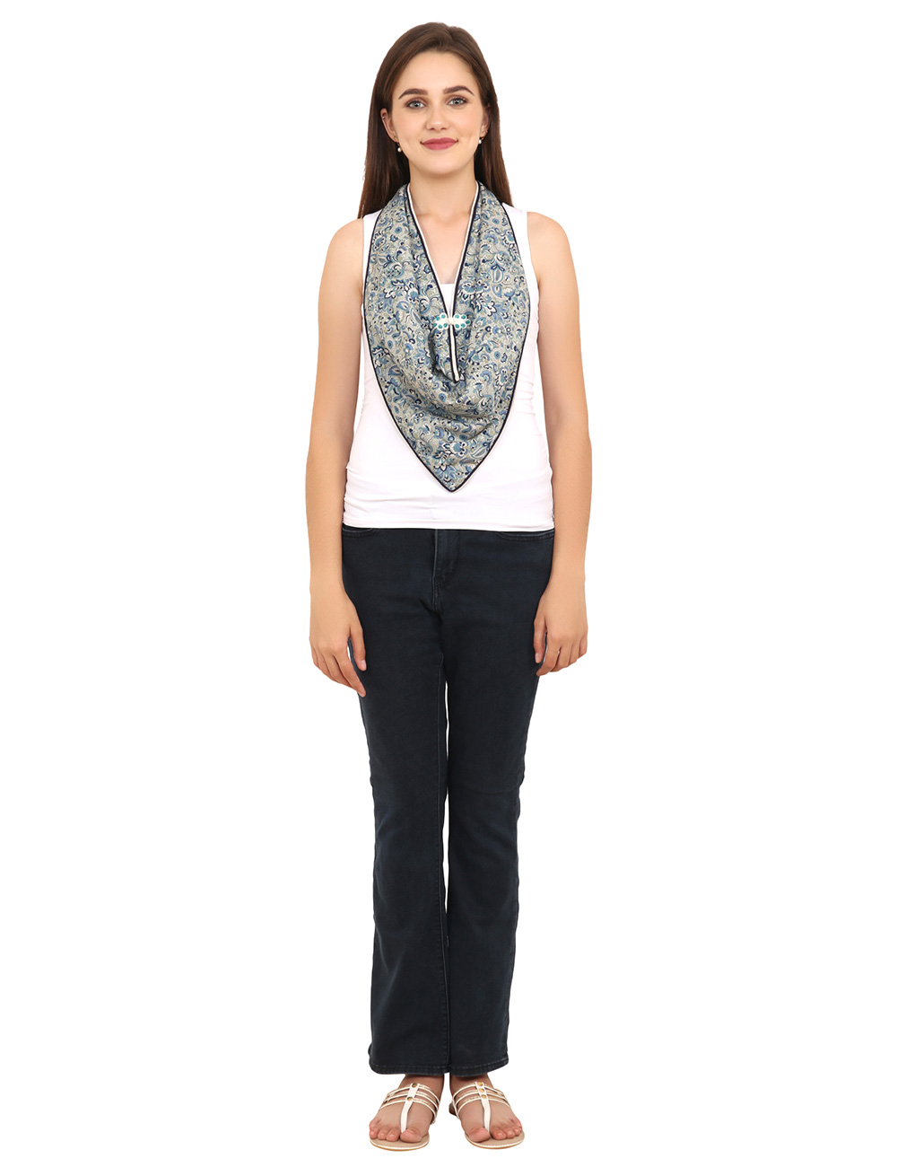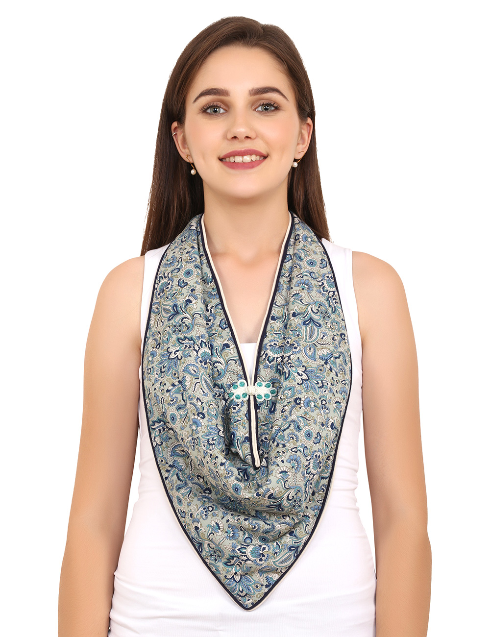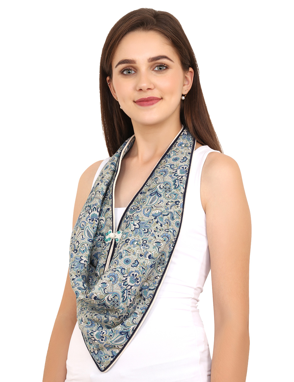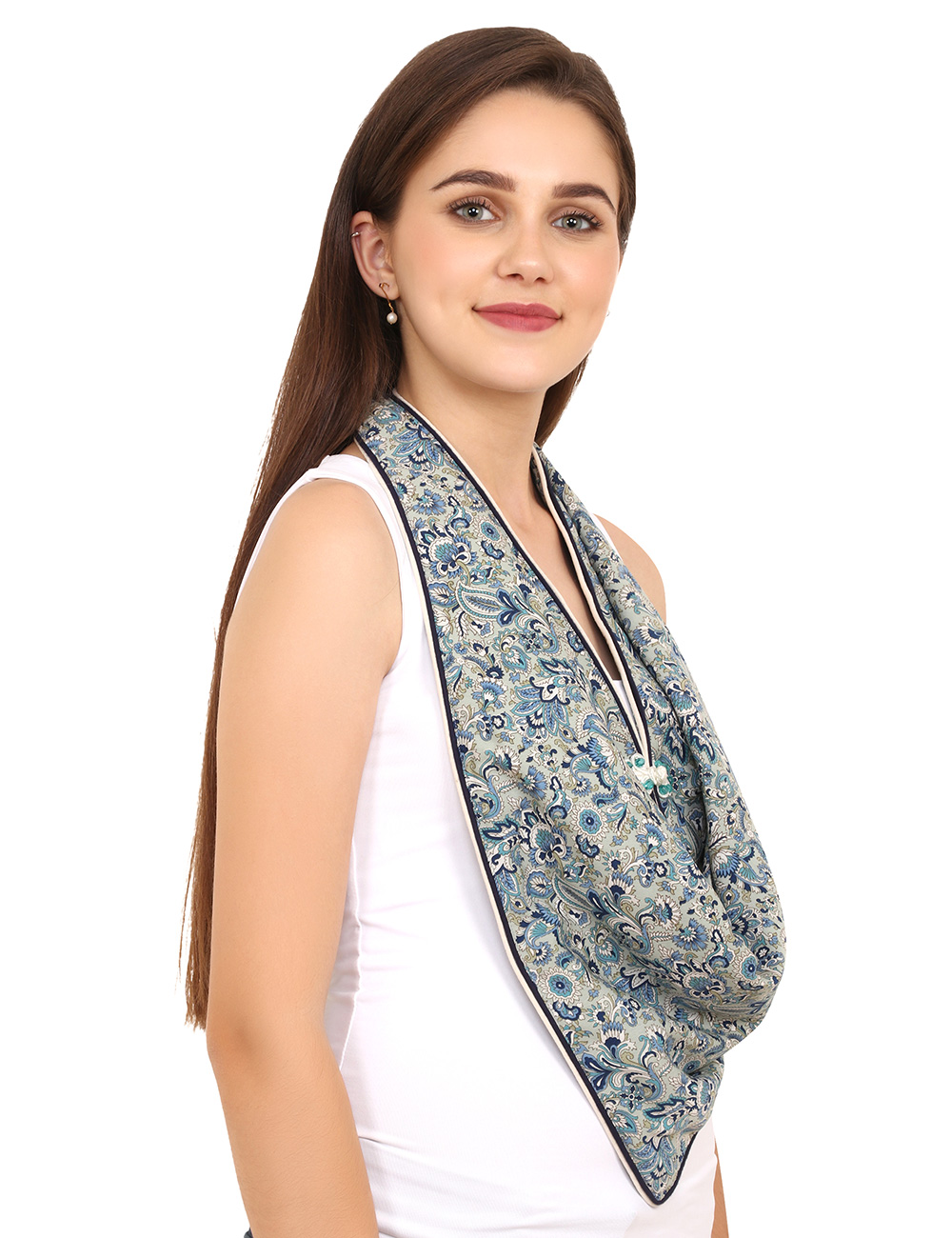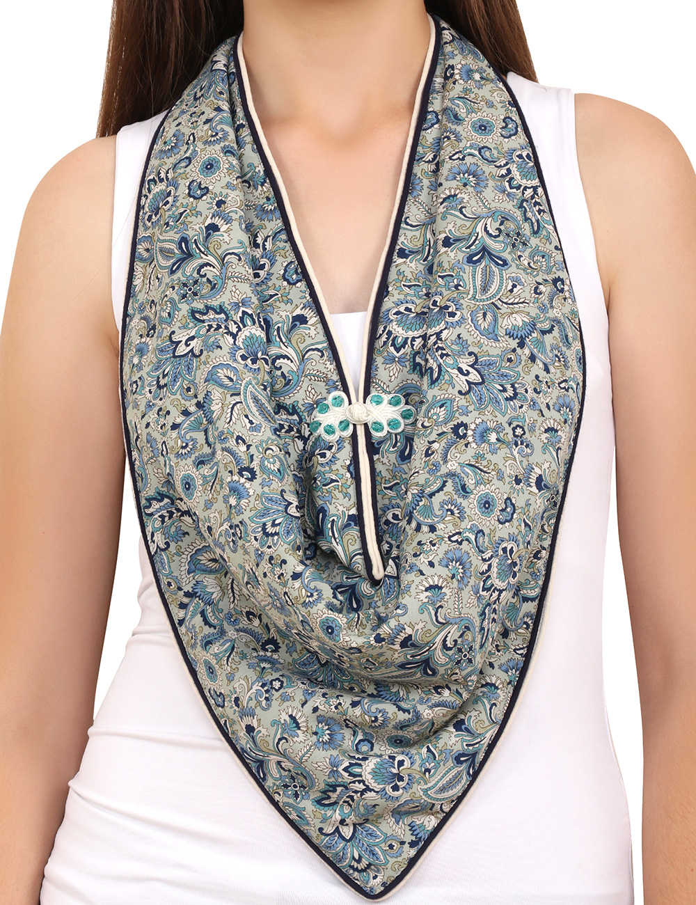 Add charm to your style with this One of a Kind handmade crepe silk scarf. It has rayon & satin lining with navy blue, off white & blue piping. It is finished off with chinese buttons & beads.