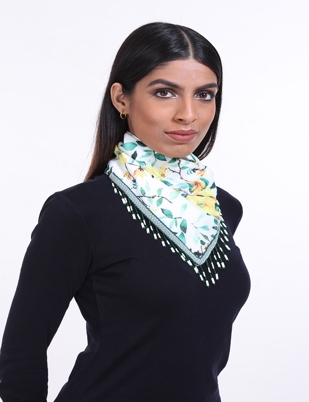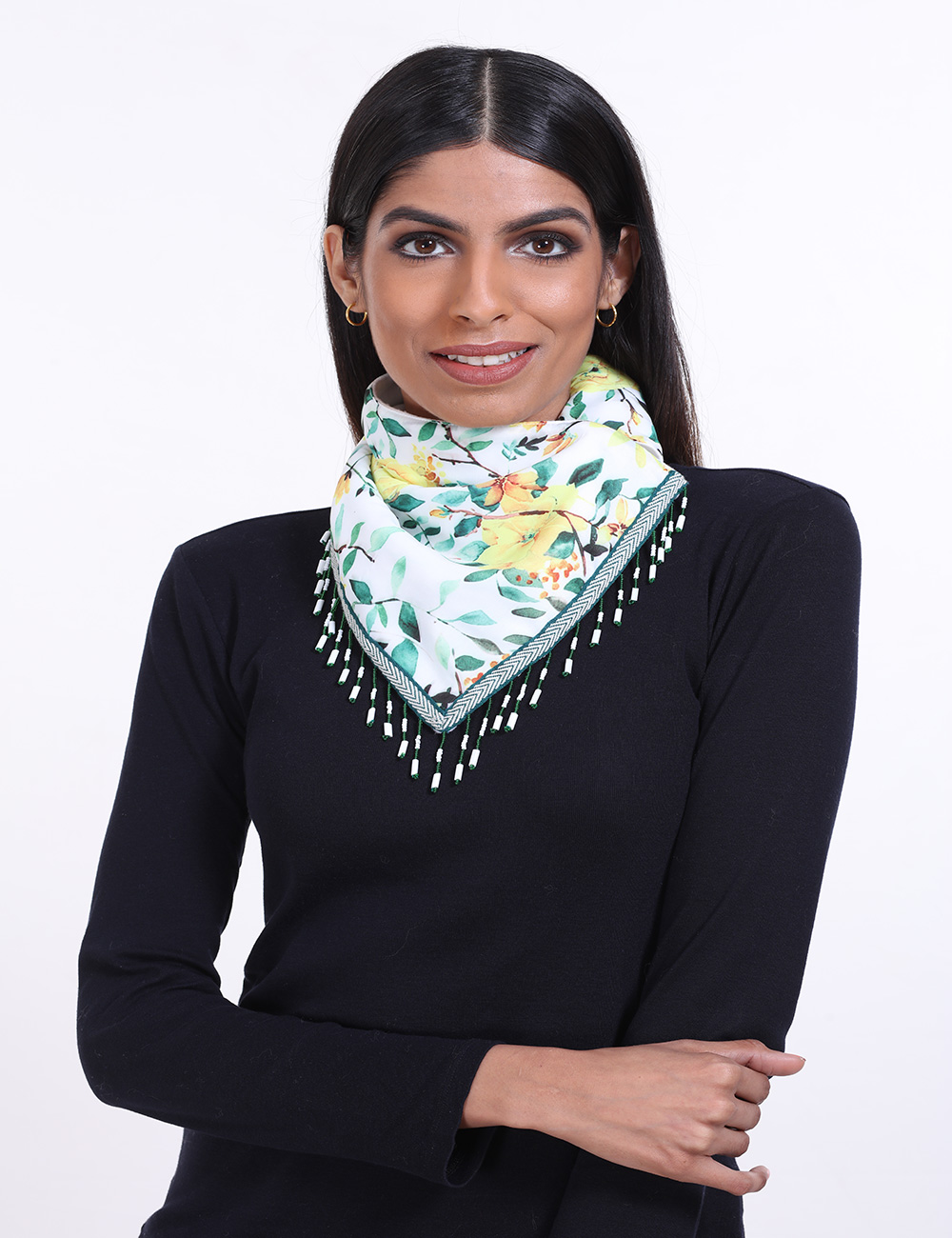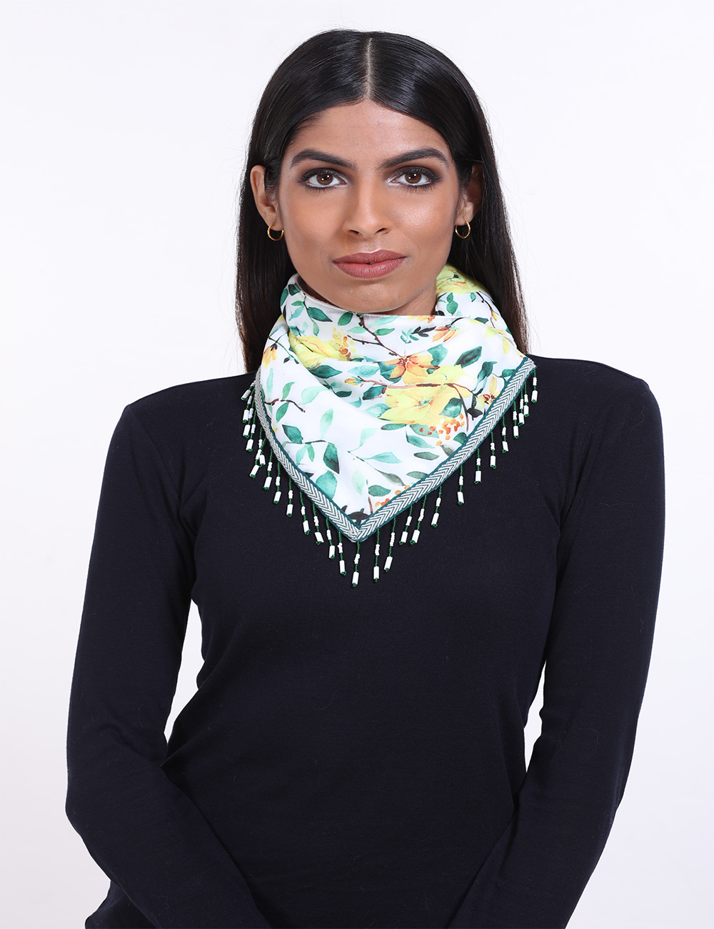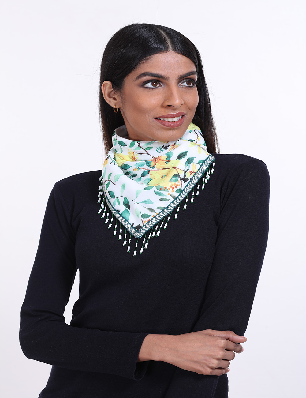 Elevate your everyday look with this One of a kind yellow & green cotton winter scarf. It has white fleece lining with green & white beading at the border.