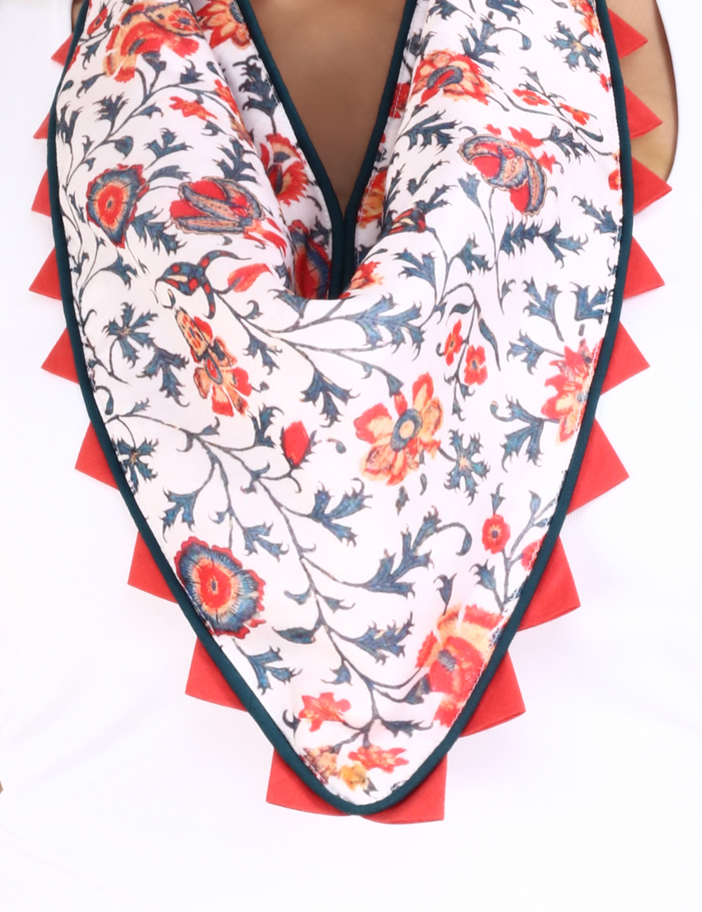Adorn yourself with this beautifully handmade linen satin scarf. It has satin lining with dark green piping. It is finished off with zig zag border.