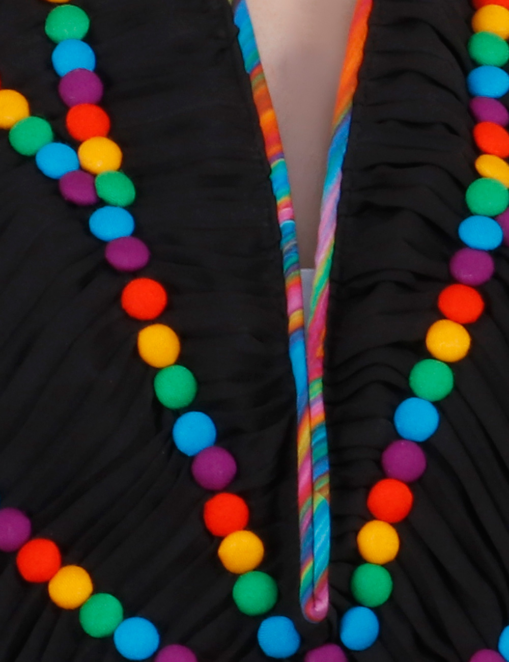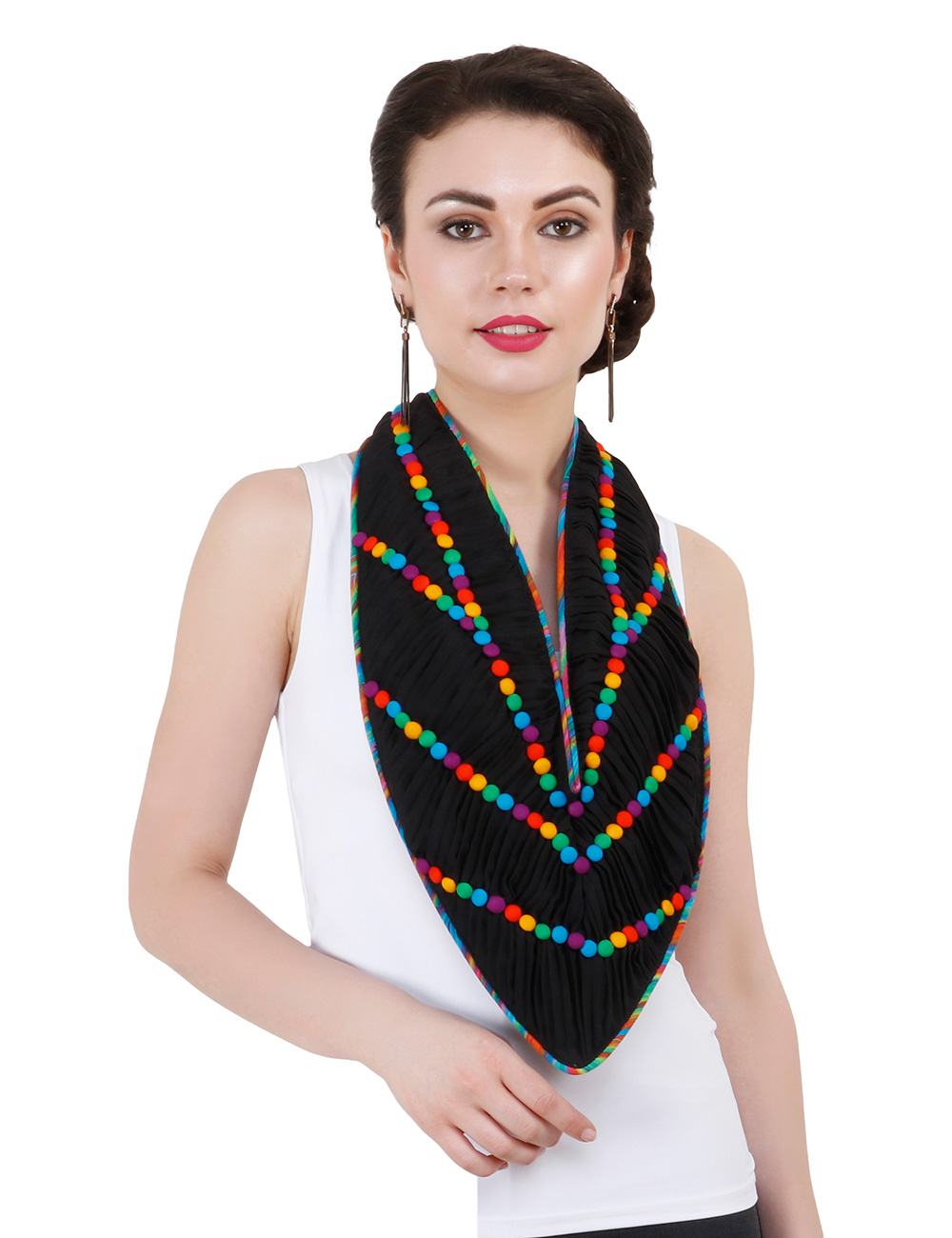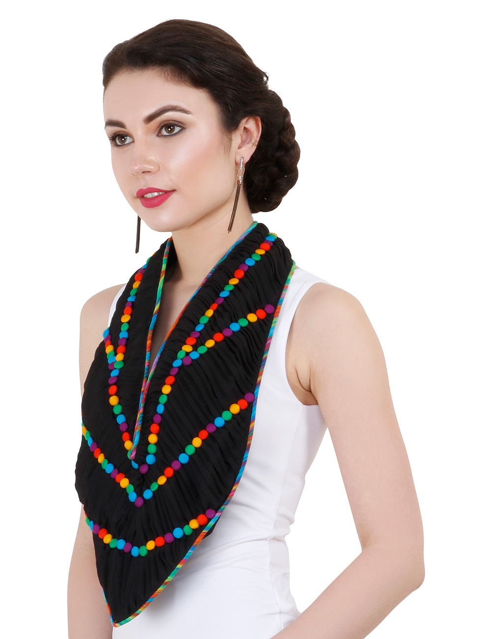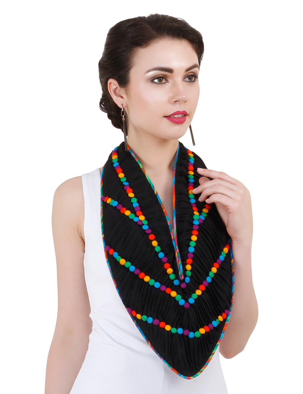 Purple Sunshine present a beautiful handmade One of a Kind crepe pleated scarf. It has satin & black crepe lining with multi coloured piping.