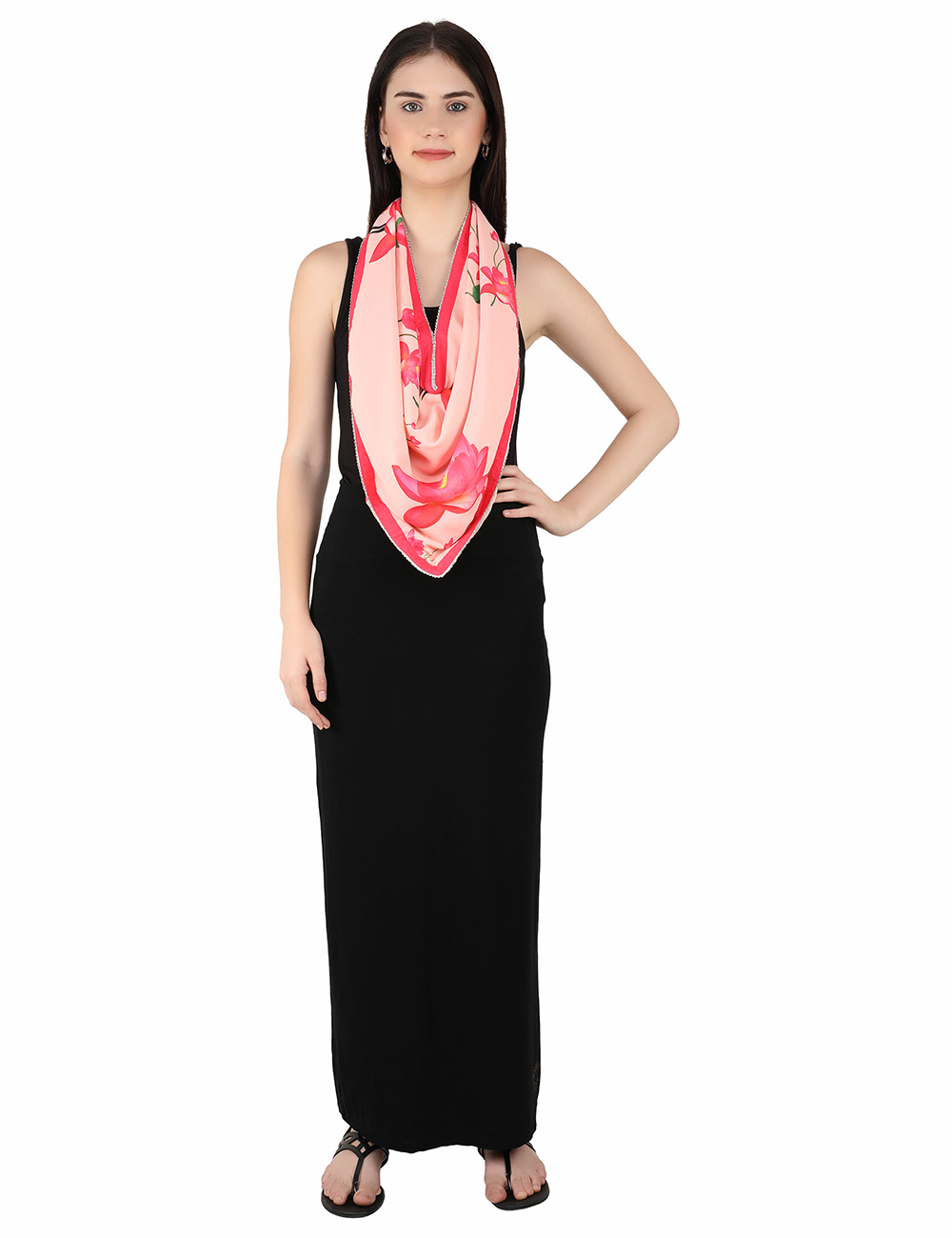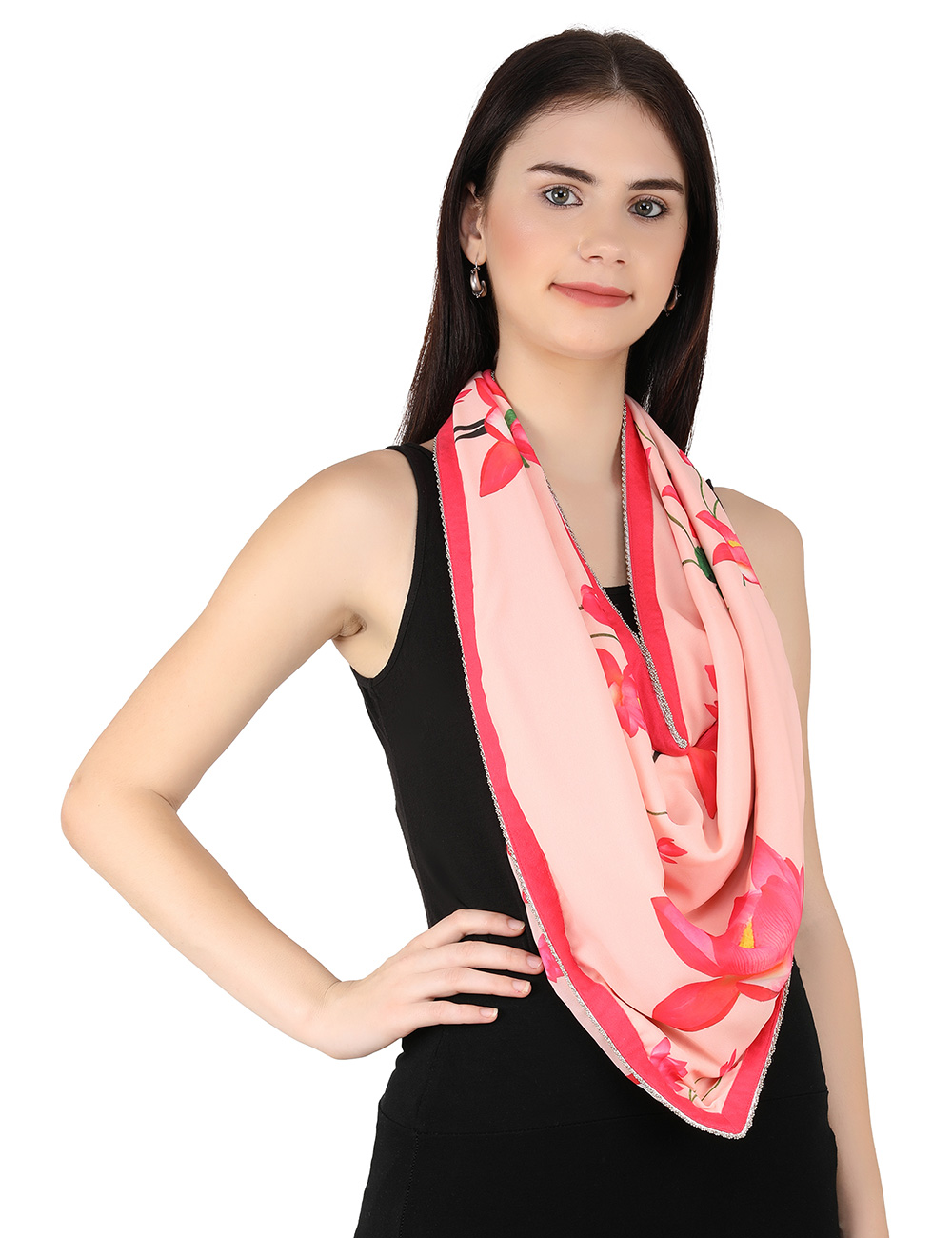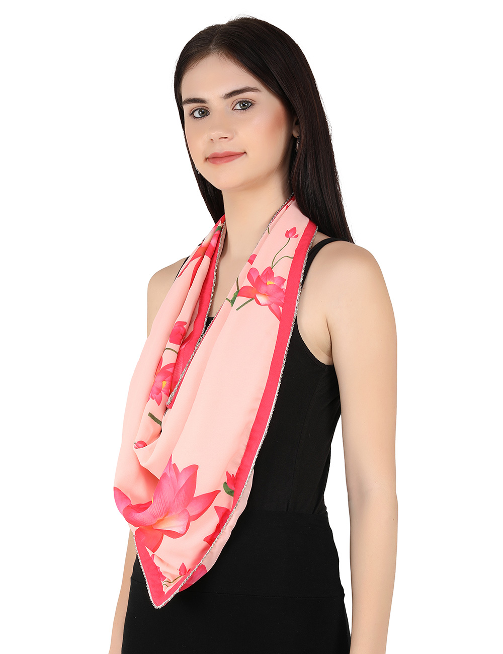 This scarf gives you the elegant look that makes everyone heads turn on you. It is a One of a Kind Handmade scarf which has rayon lining with pink flat piping. is finished off with silver metal lace at the border.